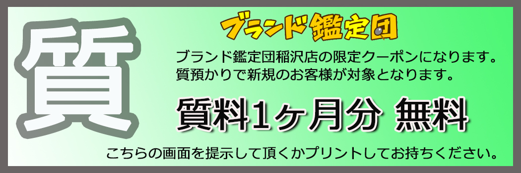 ブランド鑑定団稲沢店の限定クーポンになります。稲沢店で質預かりを初めてご契約されるお客様に限り質料1ヶ月分無料になるお得なクーポンです。
